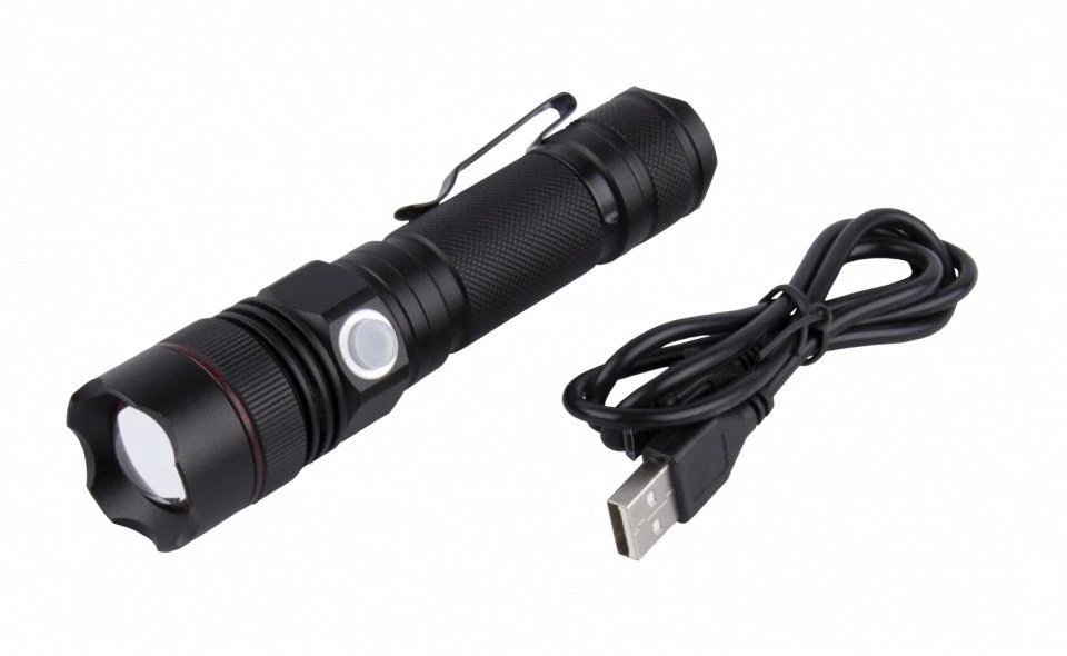 This is a compact, professional torch which is manufactured from aircraft grade aluminium and black anodised for protection. It employs Cree XM-LT6 LED technology. The impressive beam can be alternated between spot and floodlight function by sliding or retracting the head. You can also choose between high or low power mode to suit your needs via a tactical switch. This torch operates via a rechargeable battery (B21). It comes with a micro USB cable for recharging which takes about 4-5 hours from a fully discharged battery. Life of the battery is 6 hours on low beam and 2 – 2.5 hours on high beam. High beam provides 500 lumens. Also featured is a pocket clip and a power and charging indicator light on the switch.