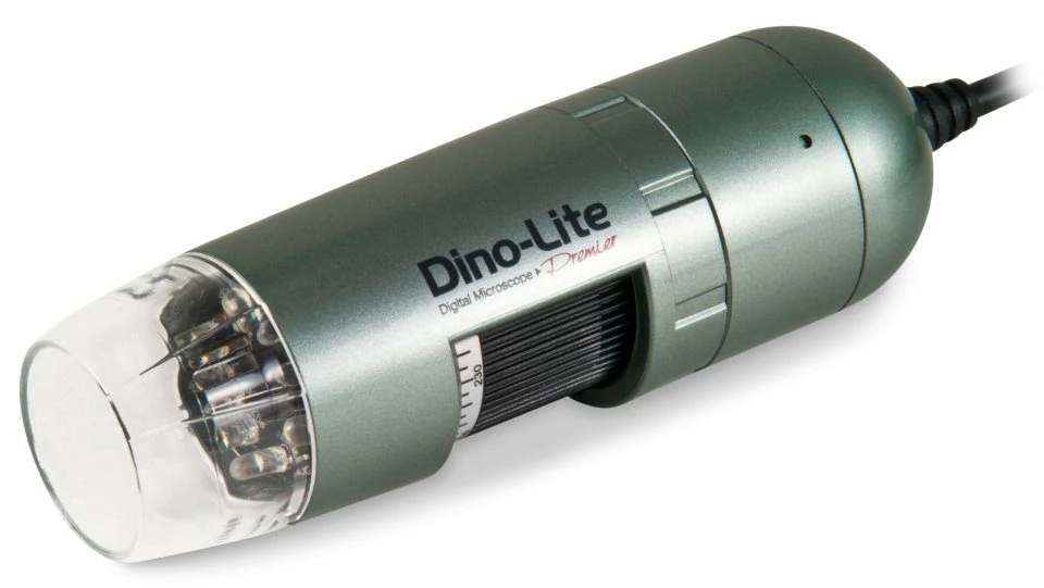 The AM3113T is part of the Dino-Lite Premier range, an affordable collection of digital microscopes ideal for home or educational use. Variable magnification of 10x-60x is controlled using the ridged thumbwheel and a further 200x magnification setting is possible when the microscope is held directly above the specimen. The eight white LEDs provide illumination of your subject and are controlled using the software provided. A sensitive microtouch button allows a snapshot to be taken with minimum camera shake.