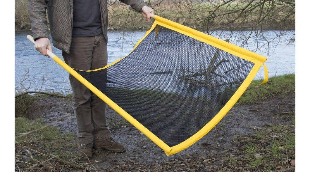 The Banner Net consists of a rectangular net measuring 90 x 100cm which is supported on each side by a wooden pole. The bottom edge of the net is reinforced with a flexible rubber rod which can be removed and slotted into its own pocket when the net is rolled up for storage. Two velcro tabs keep the net rolled neatly when not in use. Available with 500μm mesh which is ideal for kick sampling of benthic macroinvertebrates, and with 4mm mesh which is useful for electrofishing. Supporting poles are 120cm long and have a diameter of 2.5cm.
