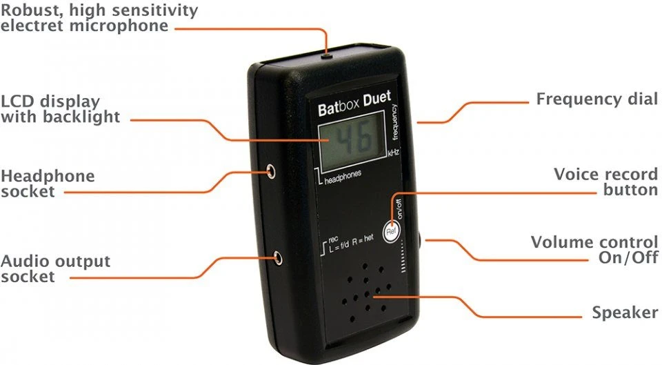 The Batbox Duet is a dual-mode bat detector which uses both heterodyne and frequency division methods. This makes it an ideal choice for those who want to progress their bat detecting skills and who are looking to listen to bats in the field as well as record the sounds for later analysis.