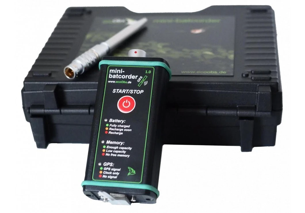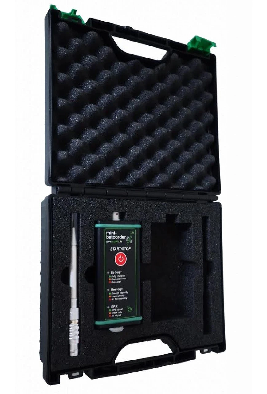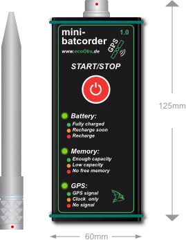 The Batcorder Mini provides a compact and economical option for the automatic detection and recording of bat sounds. It features a very simple user interface with just a single button to start and stop recording. A panel of LEDs indicates the battery life, memory space and GPS connection status.