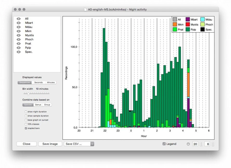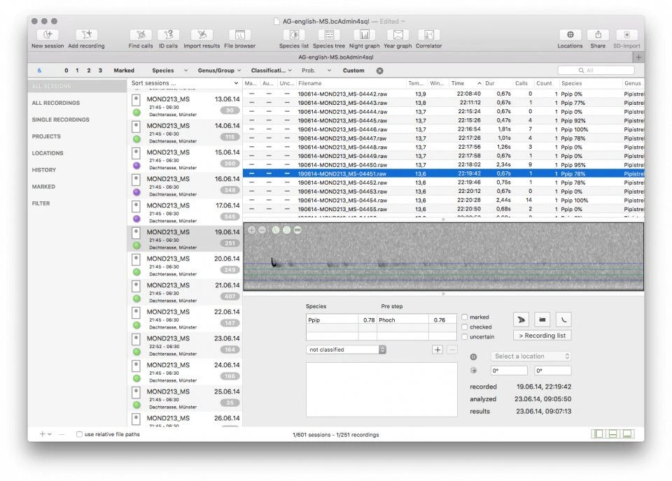 bcAdmin 4 features a simple yet powerful interface giving access to your recordings and enabling you to manage and store calls and their meta information according to sample date and location (sessions). bcAdmin 4.0 now enables you to also store single file references without a session. Both session and recordings can be connected to various metadata like locations or climate data. In interaction with batIdent, recordings are identified at genus and/or species level. After importing these results, reports or graphs can be created displaying the available data. You can now display bat activity across or within nights using just one click.