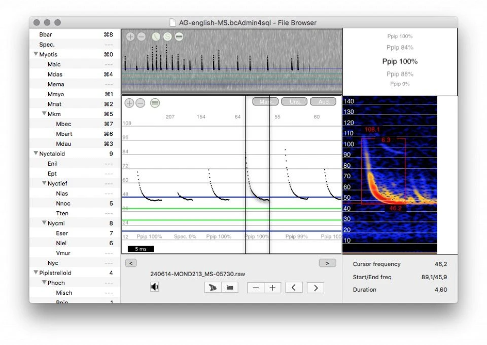 bcAdmin is the main application for managing and analysing Batcorder recordings. It stores information on recordings, sessions and locations in a database for further evaluation. It is designed to complement the Batcorder but works with other recordings made by other devices as well. bcAdmin implements the analysis of bat call sequences and stores measurements in special files for identification with batIdent (the free software that provides a reference library of over 70,000 bat calls and counting). Bat activity can easily be displayed in tables or graphs generated by bcAdmin. The latest version of bcAdmin has been highly optimised to provide better performance and is even faster to use than its predecessors, boosting efficiency whilst remaining easy-to-use.