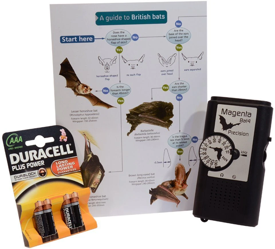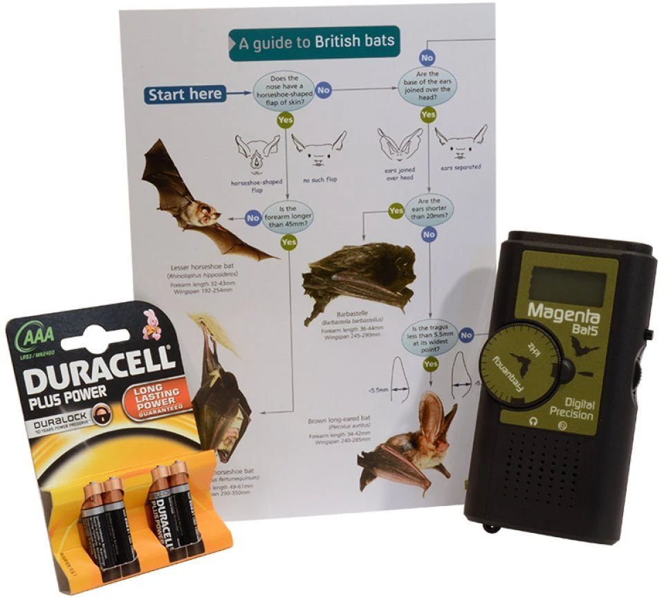 These great Beginners Bat Detecting Kits contain everything that you need to get set up for bat detecting. There is a choice of either the Magenta Bat 4 or Magenta Bat 5 bat detector, six AAA batteries and an that contains all the information you need to identify which species you are hearing (including frequency, the type of call sound and flight patterns).