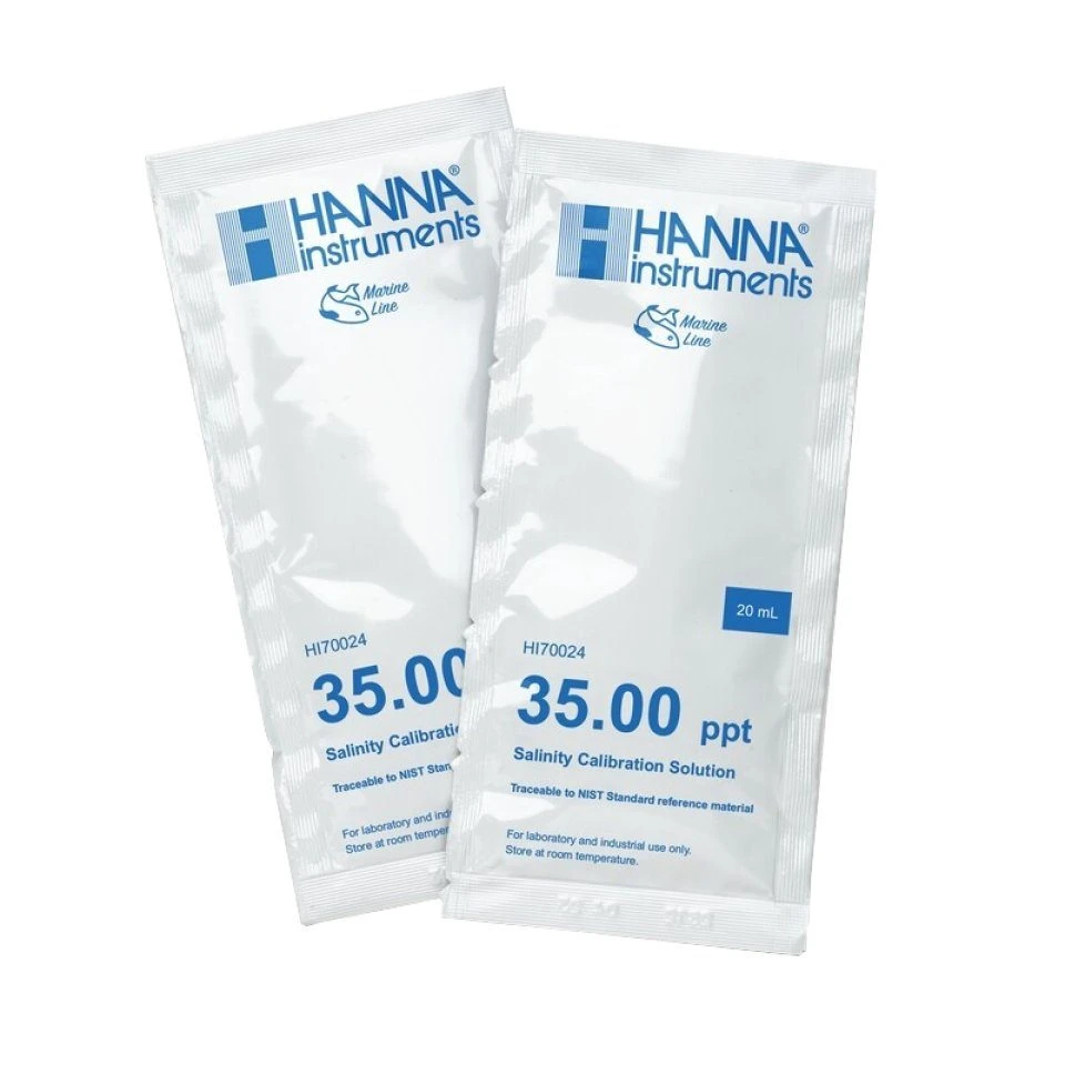 Sachets of NIST traceable 35.00 ppt marine salinity calibration solution, intended for use with the HI-98319 Salinity Test Meter from Hanna Instruments. 25 x 20ml sachets are included.