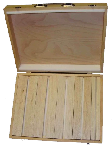 This natural wooden case is designed to carry and store your balsa wood setting boards. It has chrome-plated fastenings and a strong carrying handle. Available in two sizes.