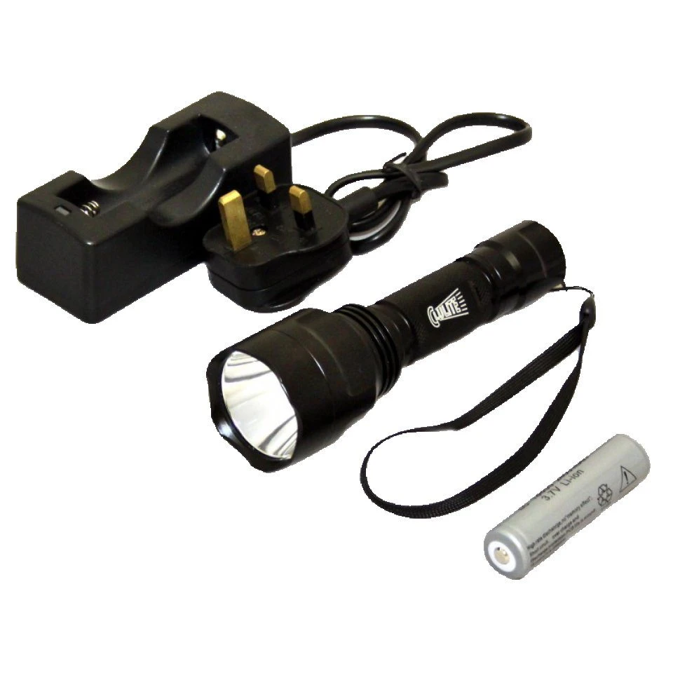 The RE1T Red Eye Torch is constructed from aircraft grade alloy which has been black anodised giving added protection and durability. This torch comes supplied with a high power rechargable Lithium-ion 18650 battery and a mains powered battery charger. However it can also be powered by two CR123 non rechargeable batteries (not supplied).