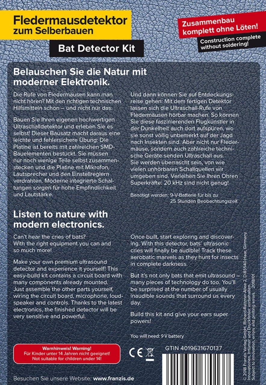 This bat detector kit is simple to assemble and does not require any soldering skills. The printed circuit board is fitted with all of the required components. All you need to do to complete the kit is to plug in the remaining parts then connect the circuit board to the microphone, loudspeaker and the control elements. A 34-page manual (in English and German) provides detailed assembly instructions.