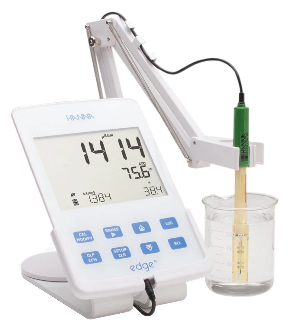 The Hanna Edge Conductivity Meter combines high precision technology with the user friendly dimensions and format of a small digital tablet. Provides measurements of electrical conductivity (EC), total dissolved solids (TDS) and salinity which are fast and highly accurate. The Edge Conductivity Meter can be mounted on a wall, handheld or positioned on a worktop.