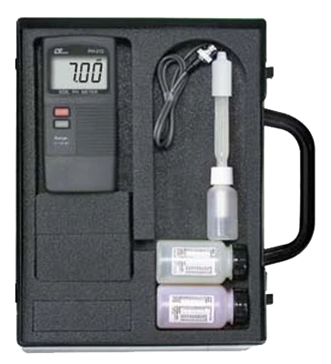 The Lutron PH-212 Soil pH Meter comes with a pH electrode, pH 4.0 and pH 7.0 buffer solutions and a plastic carrying case. The included spear tip electrode is ideal for measurement of soils as well as other semi-soft materials which require sample penetration. The electrode features a durable glass measuring spear packaged in a rugged epoxy body. The hand held meter has a large LCD display with easy to use push buttons and is powered by a 9V battery (not included).