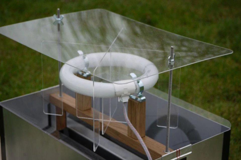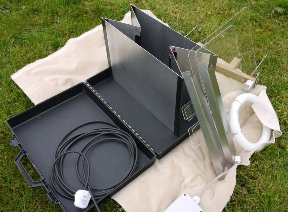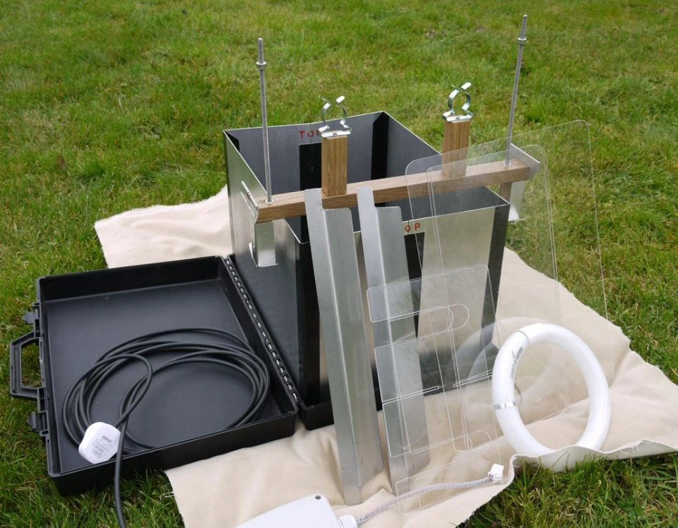 The Mobile ‘Lucent’ Skinner Moth Trap is a unique folding `Skinner’ moth trap, with the additional benefits of `Heath’ trap type moth deflector vanes. Every component fits snugly in the robust water resistant PVC carry case, which also performs as a base to hold the trap during operation. The design allows for maximum portability and easy storage. This is the 22W circular actinic version that runs off mains electrics.