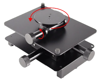 The MS15X Dino-Lite X-Y Base with Removable Rotating Table provides an excellent solution for applications that require fine X-Y, or rotational control, over the specimen being examined. Used without the rotating table the MS15X provides a 137mm x 105mm platform with 33mm of fine control in both the X and Y directions. Used with the rotating table the MS15X provides a 55mm diameter platform with 360 degree of rotation while still offering fine control over the X and Y directions.
