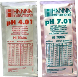 A box of 10 sachets. 5 of pH 4.01 buffer solution and 5 of pH 7.01 buffer solution. Each sachet contains 20ml of solution and can be used for calibrating any pocket pH meter, or any pH meter with a conventional pH electrode.
