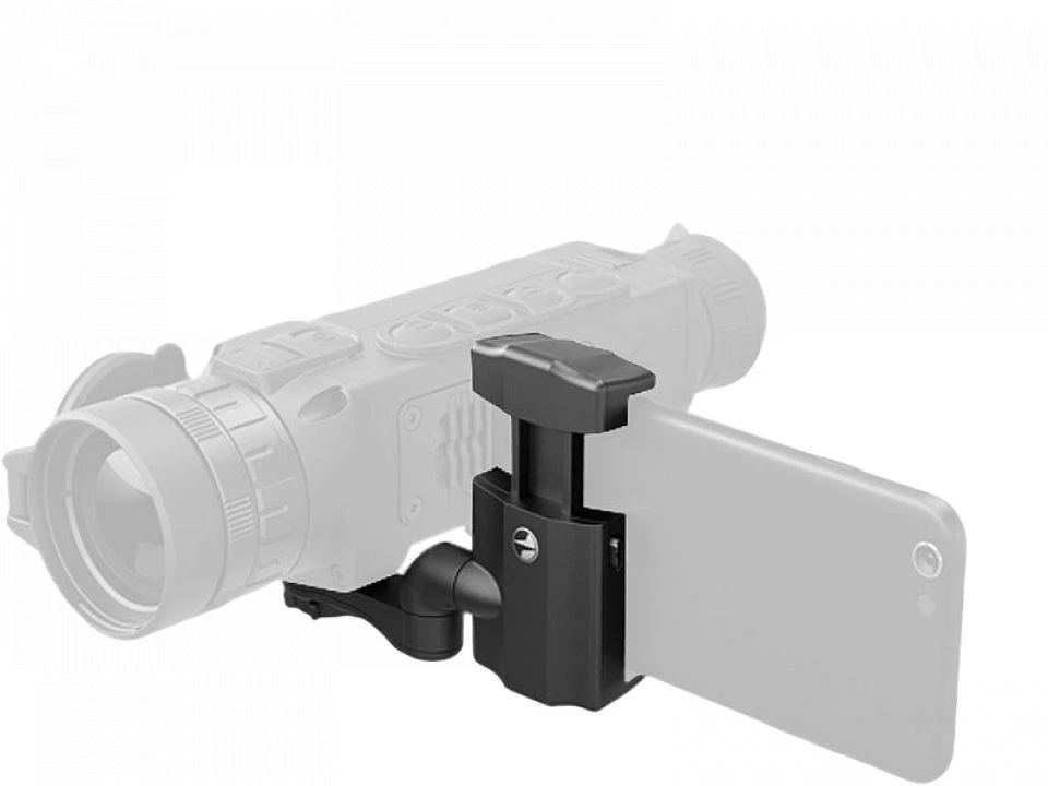 The Flip-Up Phone Mount fixes a smartphone to the side of a Pulsar Helion thermal imaging device to act as an external display by connecting to the Stream Vision app and using the remote live-view function.