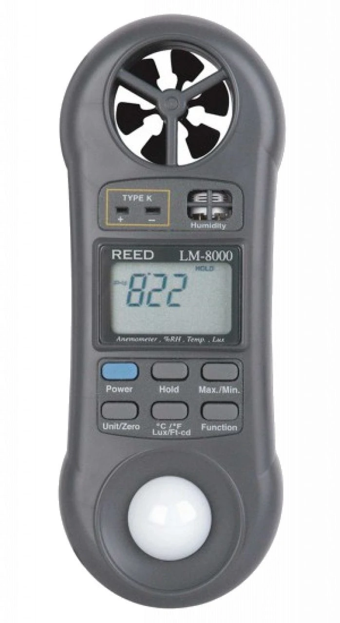 This compact 6-in-1 environmental meter measures air velocity, air temperature, ambient temperature, relative humidity, light and contact temperature. The LM-8000 features data hold, min/max functions and has been designed for easy one-handed operation.