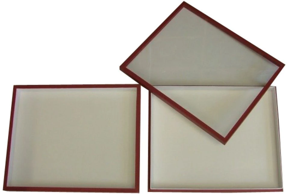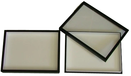 This entomological storage box is made from wood covered in book binding cloth. It measures 30 x 40 x 5.4cm and has a glass lid. A plastazote layer in the bottom of the box provides an ideal surface for pinning.