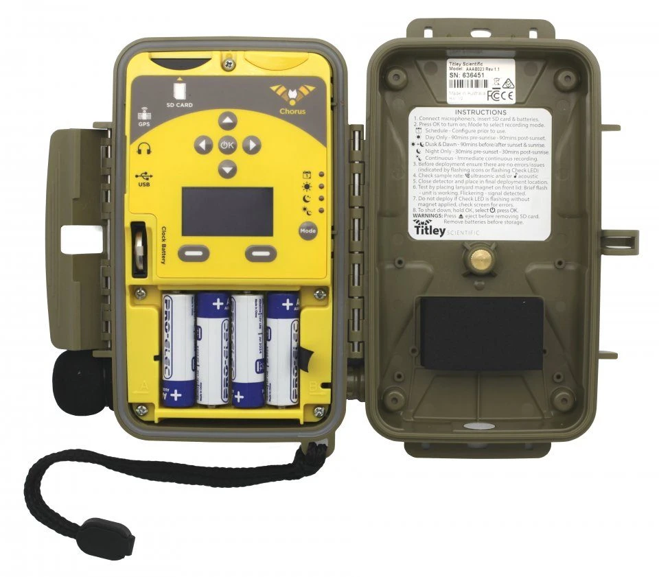 Titley have designed the Chorus to maximise its deployment time. Using a set of x4 AA batteries its typical battery life is around 300 hours when used for acoustic recordings and up to 40 nights when used for ultrasonic recordings.