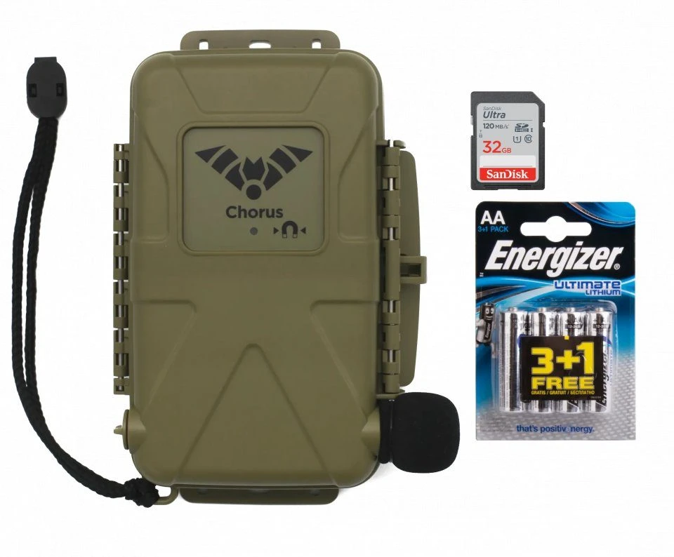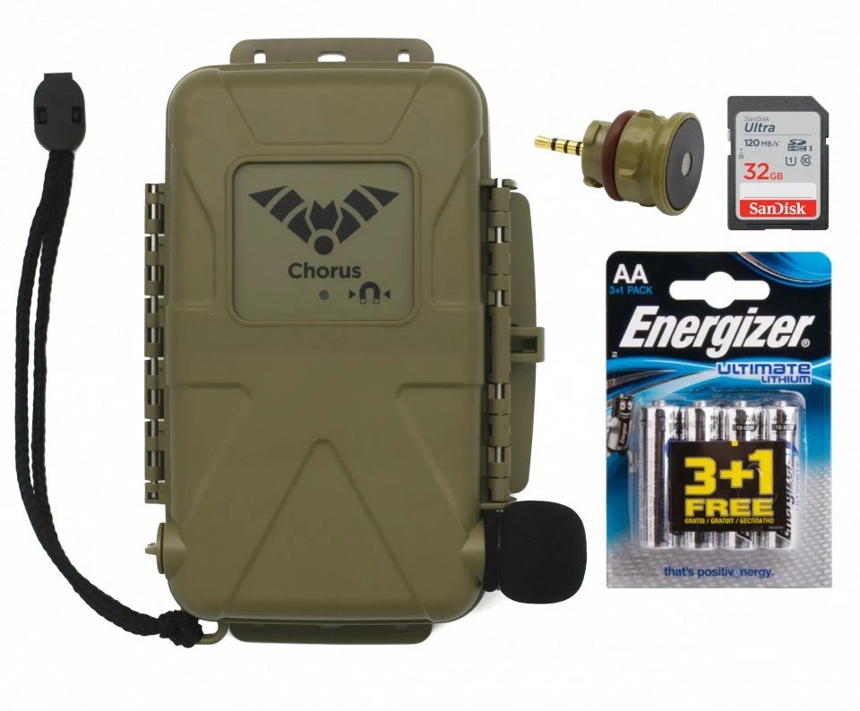 The Chorus is also available as a starter bundle which includes the Chorus (with a single acoustic or one acoustic and one additional ultrasonic mic), 4 x Lithium AA batteries and a 32GB SDHC card.